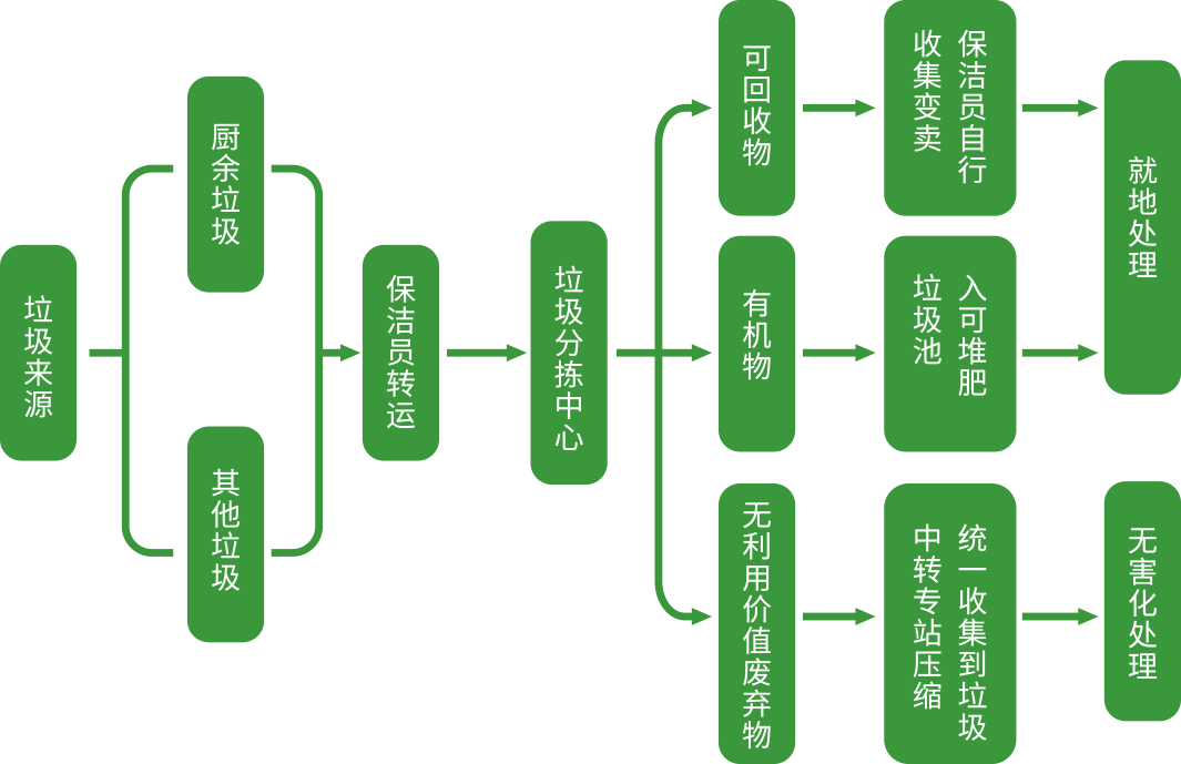 建立城乡垃圾三级分类收运处置体系,真正实现垃圾的减量化、资源化、无害化:一级为户内分类,垃圾进行源头分类,分类垃圾桶配装到每户,垃圾收集车进行分类收集,将可降解、堆肥的有机物与可回收垃圾、有害垃圾及其它垃圾分装; =级为转运分类,分类垃圾每天由专用分类车辆分别收运至有机垃圾终端处理设施处置和乡镇中转站压缩后转运至不同的未端处置场所等,压缩后的垃圾按照类别分别转运; 三级为处置分类,即分类转运的垃圾进行资源化、无害化处理。